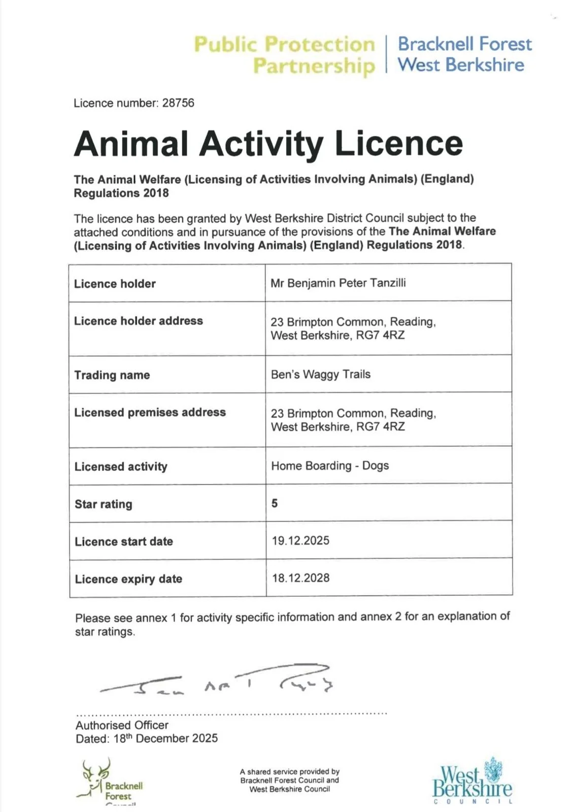 5 star Licence for providing home boarding for dogs issued to Mr Benjamin Tanzilli, Ben’s Waggy Trails, 23 Brimpton Common, Reading, Berkshire, RG7 4RZ